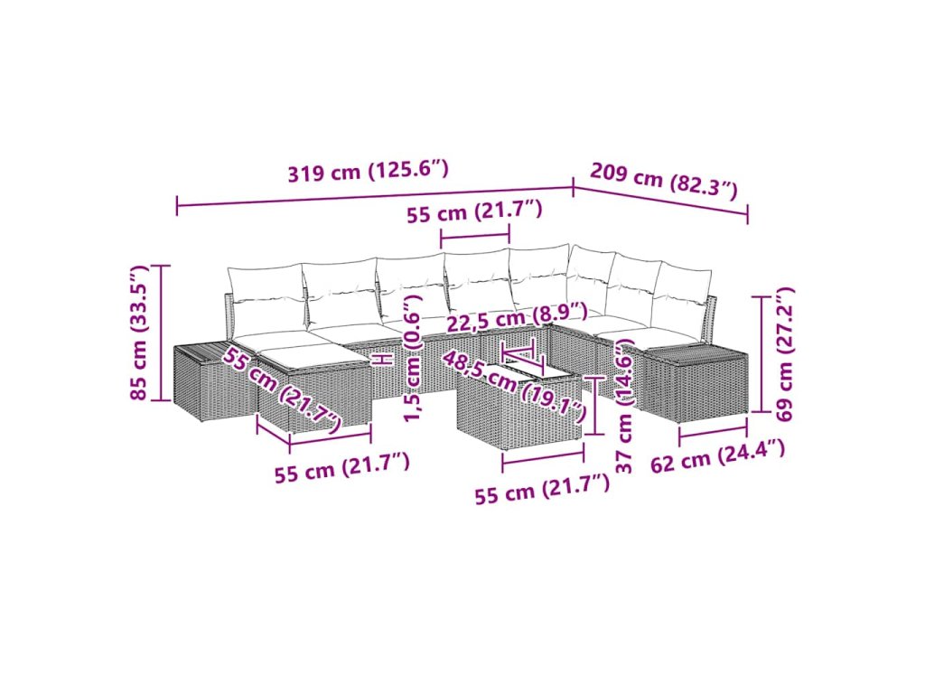 - Výstavba z polyratanu Vyrobeno z kvalitního polyratanu, tento pohovkový set je odolný a stylový, zajišťuje pohodlné sezení, které přežije venkovní podmínky. Tkaná struktura dodává elegantní vzhled, ideální pro zahradní dekoraci.