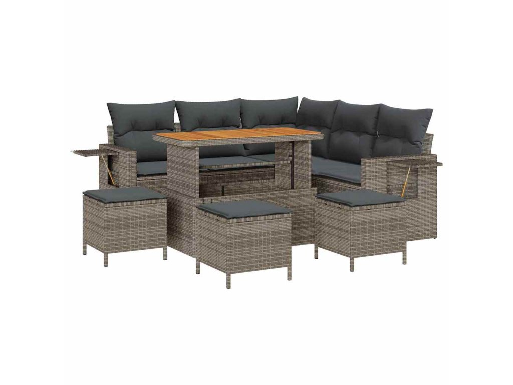 - Prémiové materiály: Sada modulárního zahradního gauče je z kvalitního polyratanu, známého svou odolností a schopností vydržet venkovní podmínky, což zajišťuje dlouhý životnost. Doplňuje ji masivní akáciové dřevo, které činí sadu přitažlivou a elegantní.