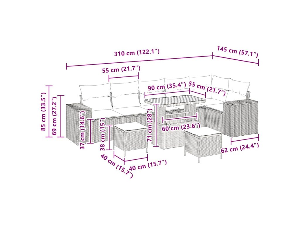 - Materiály: Sedačka je z odolného poly ratanu, což jí dodává jak odolnost, tak stylový vzhled. Tento materiál je super trvanlivý a i po vystavení slunci a vlhkosti vypadá skvěle. Poly rattan zvyšuje jeho atraktivitu a je skvělou volbou pro venkovní prostory.