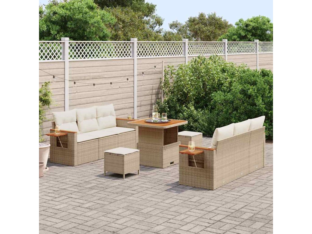 Materiály: Tato zahradní sedací souprava je vyrobená z odolného poly ratanu, takže nejen vypadá dobře, ale taky zvládne jakékoliv počasí. Práškově lakovaná ocelová konstrukce poskytuje stabilitu a poskytuje pohodlný základ pro relaxaci venku. Povrch je fakt hezký s masivními akáciovými dřevěnými plochami, které dodávají moderní, ale přesto přírodní nádech. Součásti sady: Tato souprava zahrnuje čtyři křesla, dvě střední sedačky a dva čtvercové stoličky. Můžeš si je snadno uspořádat, jak potřebuješ, a k tomu je tu odpovídající stůl, takže to máš skvělé jak na relaxaci, tak na jídlo. Vlastnosti / Funkce / Design: Modulární design ti dává možnosti, jak si to nastavit podle svých potřeb. Materiály jsou odolné UV záření, takže nevyblednou a udrží si živý vzhled. Chytrá úložná řešení s voděodolnými taškami ochrání tvoje věci před vlhkostí. Doporučené použití: Tato souprava je ideální pro zahrady, terasy a kolem bazénu — jednoduše promění jakýkoli prostor na vítaný útočiště. Je perfektní na zahradní párty, odpočinek pod slunečníky, nebo prostě sezení s rodinou a přáteli v pohodlí. Péče a údržba: Když si ji chceš udržet v dobrém stavu, stačí ji otírat hadříkem a používat kryty, když fuje počasí. Polštáře přenášej dovnitř, když je zrovna nepoužíváš, aby zůstaly v bezpečí. Trocha sezónní péče zajistí, že ti tenhle krásný nábytek bude dělat radost a relaxaci dlouho.- Barva: Béžová
