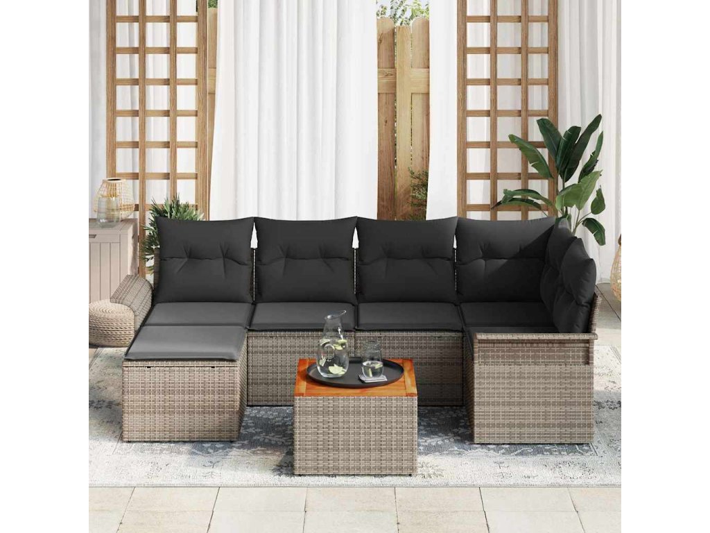 Tento set zahradního sofa je přesně to, co potřebujete, když toužíte po moderním stylu a flexibilitě. Je navržený tak, aby vaši venkovní plochu oživil svým trendy designem. Díky tomu, že si můžete hravě poskládat jednotlivé kusy, je ideální pro jakékoli setkání, ať už se chystáte jen lenošit, nebo pozvat kamarády. Kombinace poly ratanu a masivu z akáciového dřeva mu dodává velmi elegantní vzhled – ideální pro relaxaci na sluníčku.