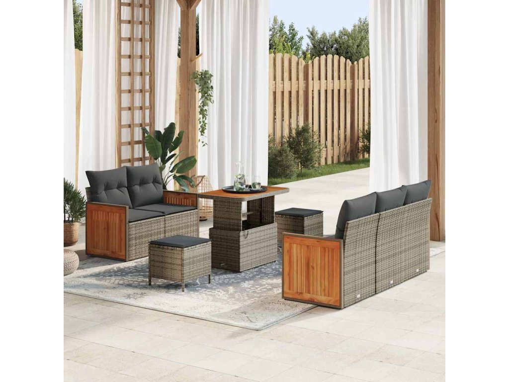 Tahle moderní zahradní pohovková sada ti nabízí stylové sezení pro všechny, kdo milují pobyt venku a chtějí do svého prostoru vnést trochu elegance a praktičnosti. S jednoduchými liniemi a minimalistickým nádechem je tato sada super pro venkovní setkání, lenošení u bazénu nebo odpočinek po dlouhém dni. Je vyrobená z pevných materiálů jako je polyratan, ocel a dřevo, takže si poradí s každým počasím.