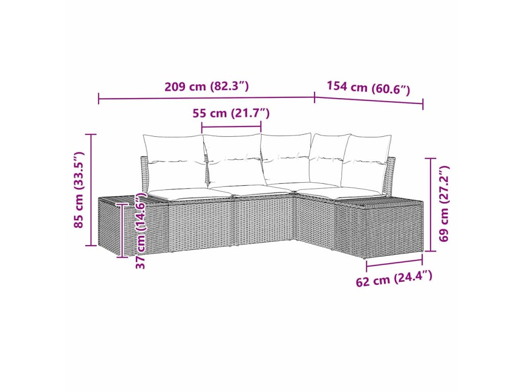 - 1 x rohové sezení: 62 x 62 x 69 cm (D x Š x V)