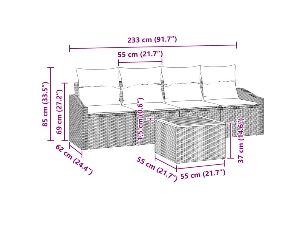 Tento stylový zahradní pohovkový set je univerzální kousek, který do venkovních prostor, jako jsou zahrady a terasy, přináší moderní nádech. Jeho elegantní design, jednoduchost a funkčnost snadno obohacují vzhled jakéhokoli prostoru a nabízejí luxusní, ale přívětivou atmosféru. Představ si chvilku relaxace na klidném místě zahrady, obklopen pohodlím a elegancí. Každý díl setu je navržen tak, aby ti poskytl maximální relaxaci, ať už plánuješ letní party nebo si užíváš klidné odpoledne s knihou.