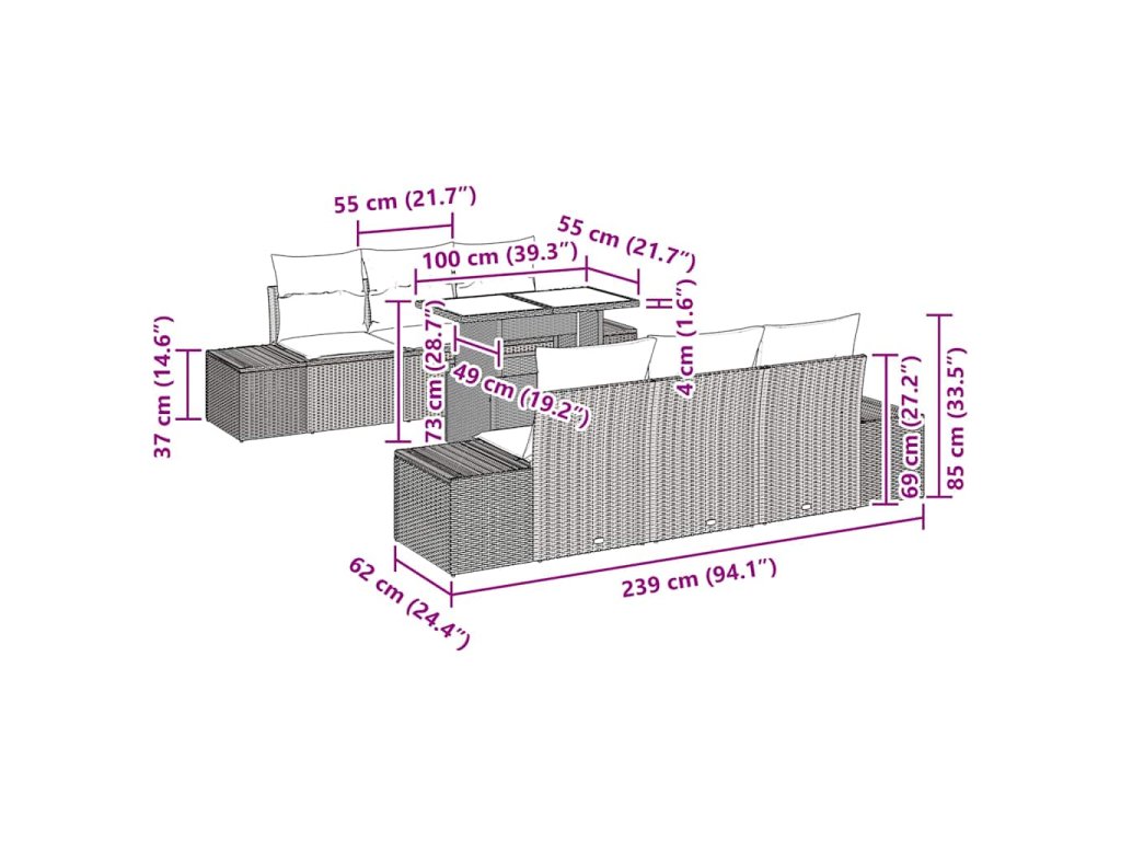 - 4 x boční pohovka: 184 x 62 x 85 cm (D x Š x V)