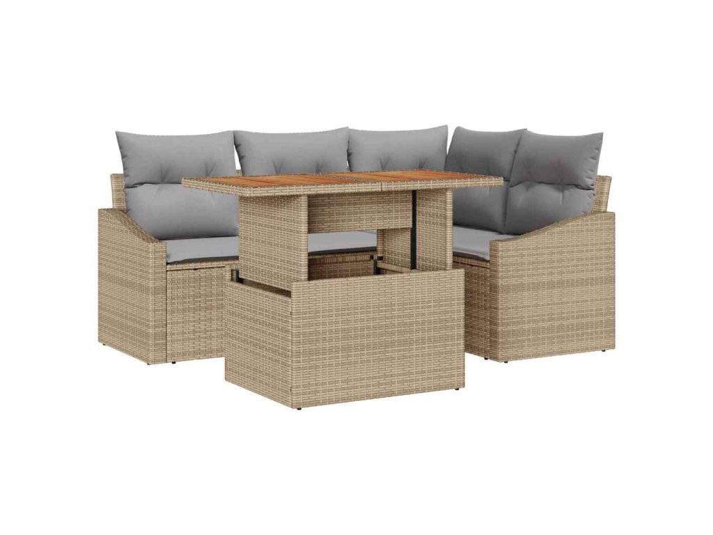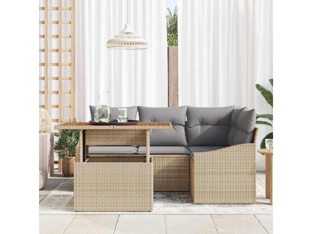 - Odolné materiály: Poly ratan a práškově lakované ocelové komponenty zajišťují, že je set odolný vůči různým povětrnostním podmínkám, nabízí UV ochranu a trvanlivost pro dlouhodobé venkovní použití. Stabilní akáciové dřevěné povrchy dodávají přírodní krásu a robustní podporu, udržují atraktivní a odolnou přítomnost na vaší terase nebo zahradě.
