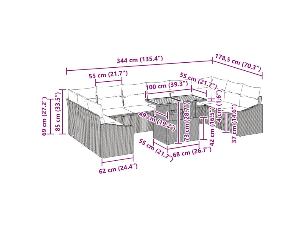 - Komplexní komponenty: Tato souprava zahrnuje složitě navržená armová sofa a rohové sedáky se skrytým úložným prostorem, což poskytuje funkčnost a styl. Robustní zahradní stůl doplňuje sezení, vše pečlivě vyrobené pro plynulé začlenění do zahrady nebo terasy.