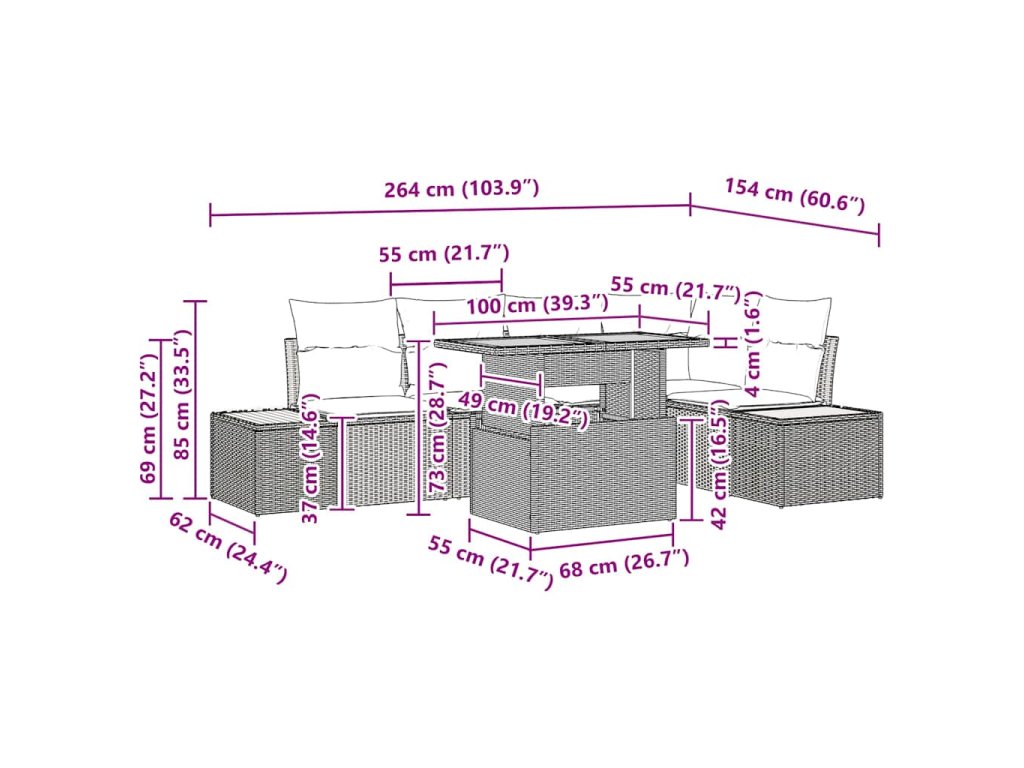 - Co je obsaženo: Jídelní set nabízí spoustu míst k sezení, s rohovým sedadlem, středním sedadlem a bočními pohovkami, které všechny mají praktický úložný prostor. Stůl se hodí pro jídlo a užívání si venku. Je to všechno o pohodlí a stylu.