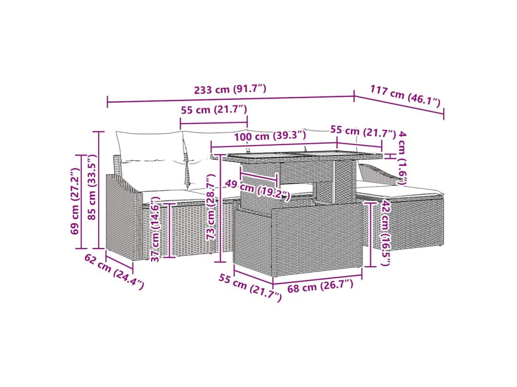 - Součásti: Sada se skládá ze dvou arm sof, dvou středových sedadel, podnožky se skladovacími schopnostmi a odpovídajícího zahradního stolu. Každý kus je dokončen poly ratanem a doplněn povrchy z akáciového dřeva.