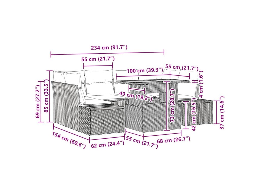- Univerzální funkce: Vyznačující se modulárním designem, tato souprava nabízí flexibilitu změnit rozložení tak, aby vyhovovalo různým potřebám a preferencím. Nastavitelné nohy mohou vyrovnat nábytek na nerovných plochách, zajišťují stabilitu a pohodlí. Kombinace sedadla s pěnovým polstrováním a poly ratanovými opěradly zajistí ergonomickou oporu, zatímco poskytuje tepelnou a vlhkostní bariéru, což přidává k uživatelsky přívětivému designu.
