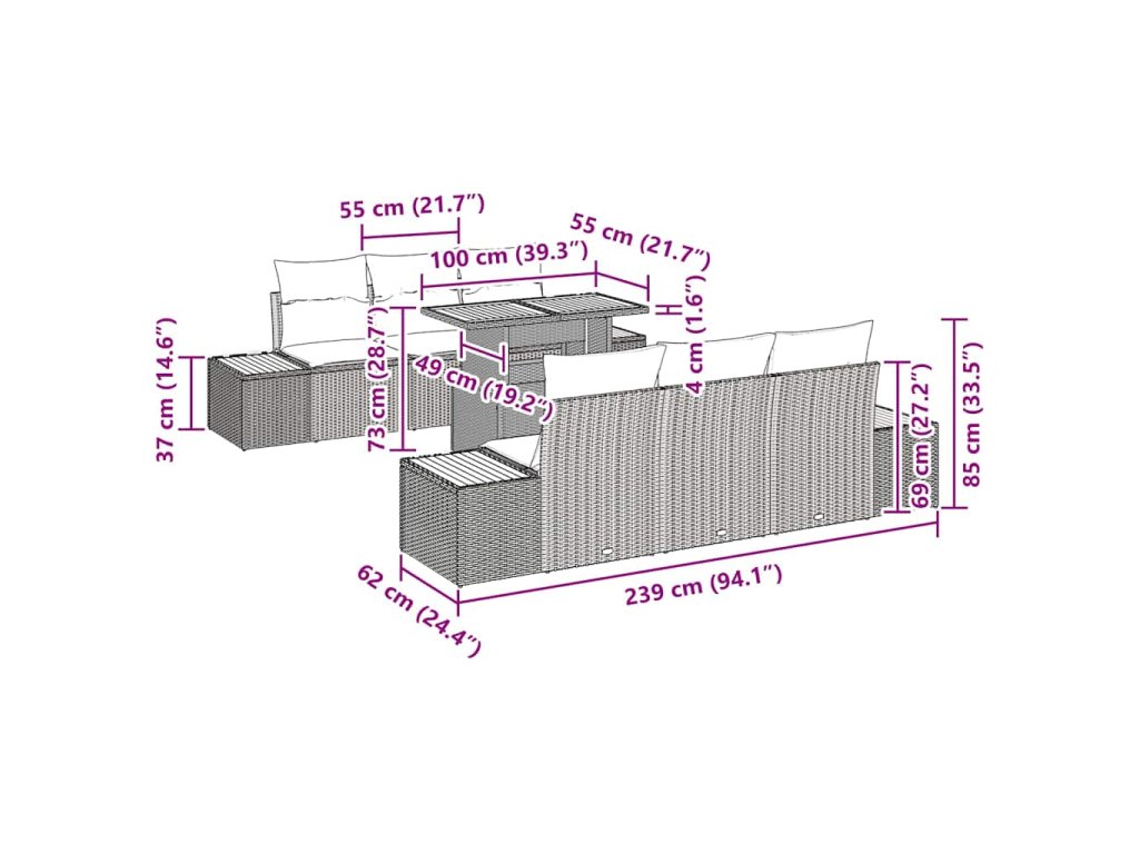 - Součásti: Set obsahuje čtyři boční pohovky a dvě středové sedáky, všechny s úložnými prostorem, plus prostorný zahradní stůl pro venkovní stolování. Odnímatelné sedáky se zipy usnadňují údržbu a zajišťují pohodlí.