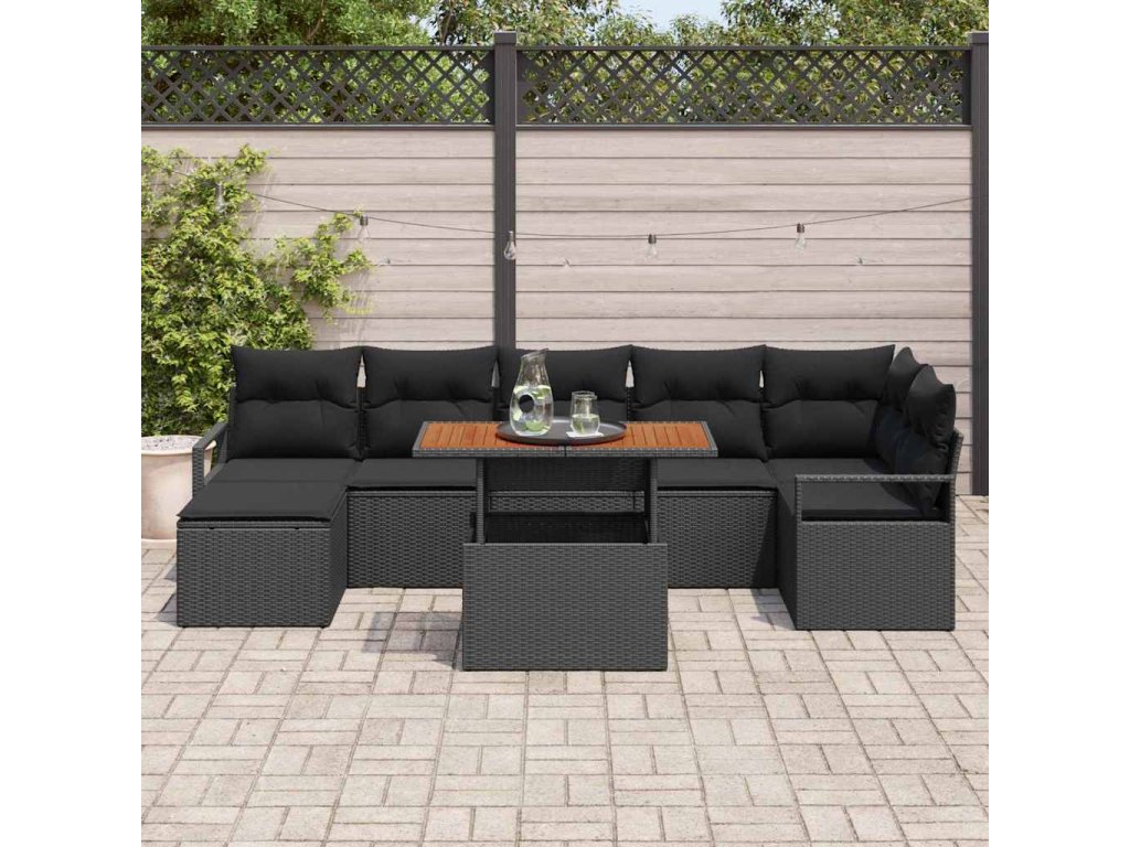 - Špičkové materiály: Vyrobený z kvalitního polyratanu, tento pohovkový set je navržen tak, aby odolal povětrnostním vlivům a UV záření, ideální pro letní použití. Odolný práškově lakovaný rám z oceli zajišťuje stabilitu a je odolný proti korozi. Pevné akáciové dřevo zvyšuje vzhled a dodává přírodní pocit, který se skvěle hodí do každé zahrady.