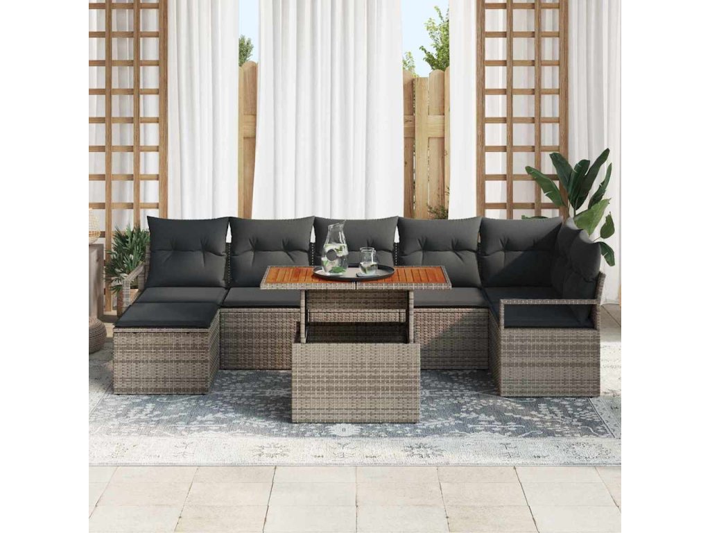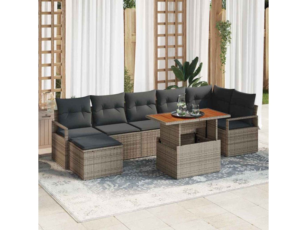 - Špičkové materiály: Vyrobený z kvalitního polyratanu, tento pohovkový set je navržen tak, aby odolal povětrnostním vlivům a UV záření, ideální pro letní použití. Odolný práškově lakovaný rám z oceli zajišťuje stabilitu a je odolný proti korozi. Pevné akáciové dřevo zvyšuje vzhled a dodává přírodní pocit, který se skvěle hodí do každé zahrady.