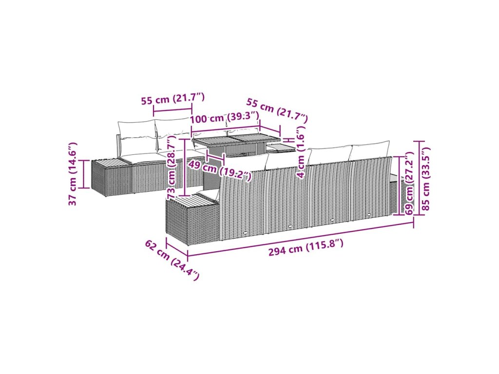 - Zahrnuté komponenty: Sada obsahuje čtyři boční pohovky a čtyři centrální sedáky, které mají úložný prostor. Zakončuje ji stylový zahradní stůl, takže máš kompletní balíček pro všechny tvoje venkovní sezení a vibes.