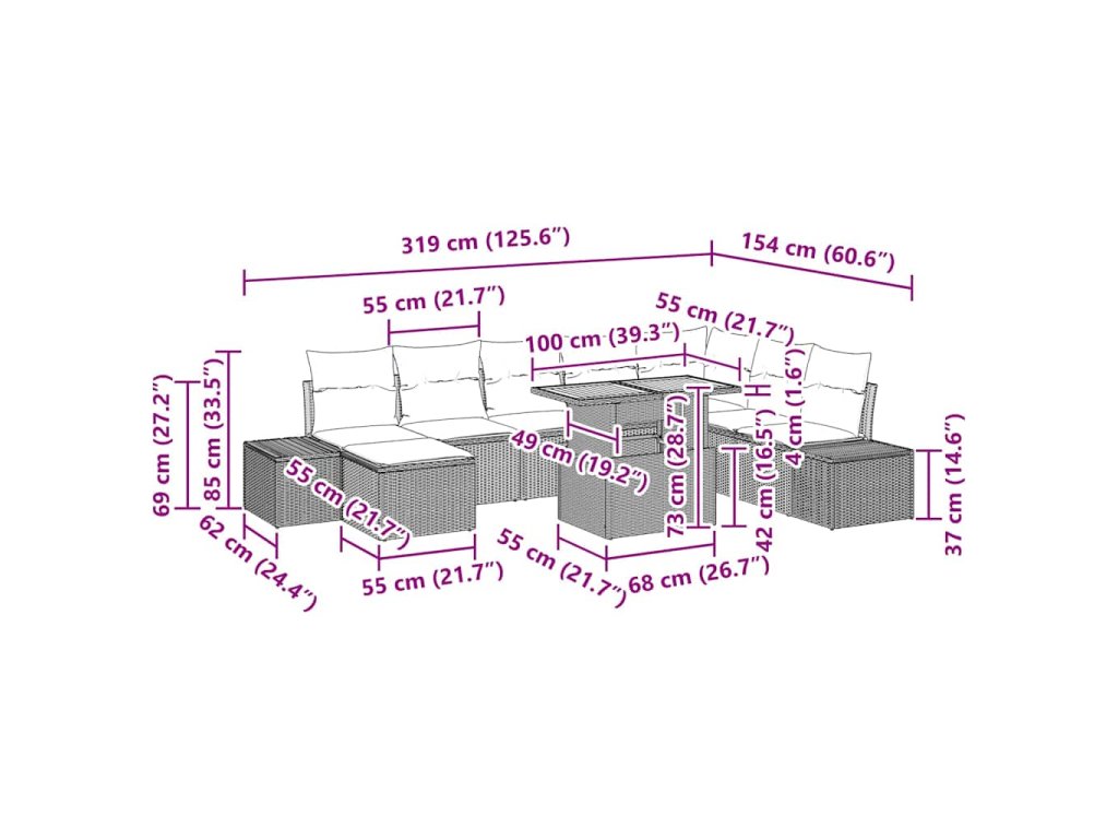 - Praktický design: Soustředěná kolem modularity, každý kus může být nezávisle konfigurován tak, aby vyhovoval jakékoli příležitosti. Dvě boční pohovky, rohový sedák a čtyři centrální kusy nabízejí úložné možnosti, maximalizující jak prostor, tak užitnost. Tato přizpůsobivá sestava tak akomoduje měnící se potřeby, od konfigurací sezení po organizaci venkovních nezbytností, plynule se přizpůsobuje jakémukoli prostředí.