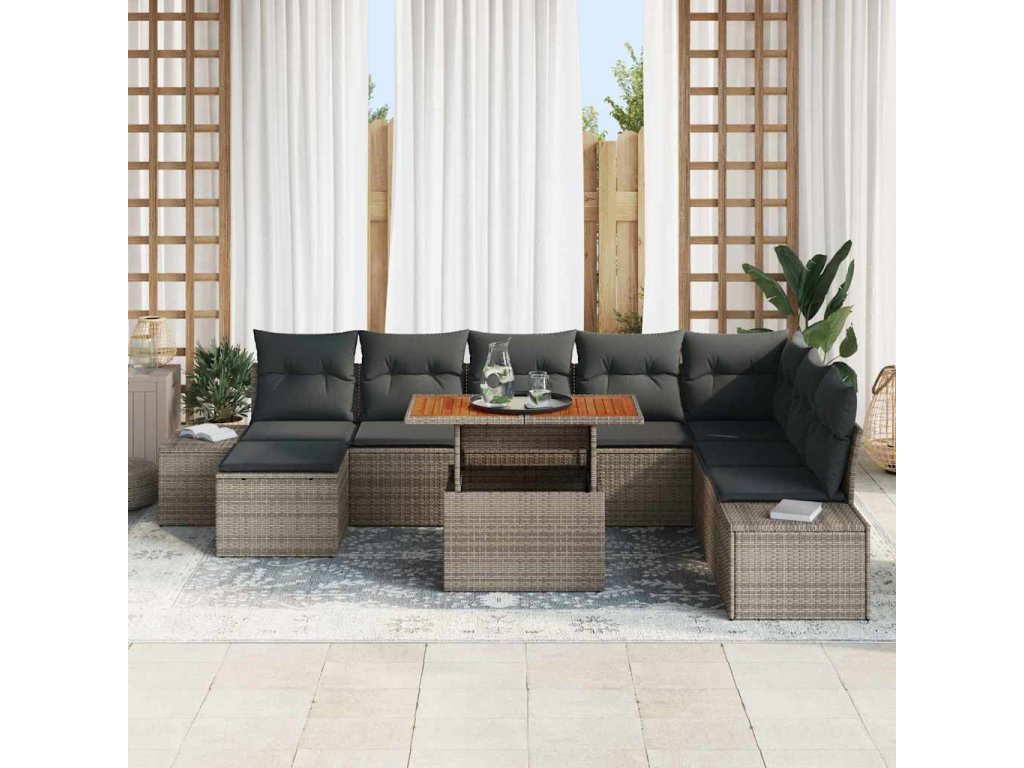 - Kvalitní materiály: Vyrobená z vysoce kvalitního poly ratanu, tato všestranná souprava představuje důkaz odolnosti a elegantního designu, který snadno odolává UV záření. Rám z práškově lakované oceli zpevňuje její stabilitu, zatímco masivní akáciové dřevo dodává elegantní a přirozenou krásu. Tyto ideální kombinace materiálů zajišťují dlouhověkost a obohacují venkovní prostředí, harmonizují s přirozeným okolím a umělou estetikou.
