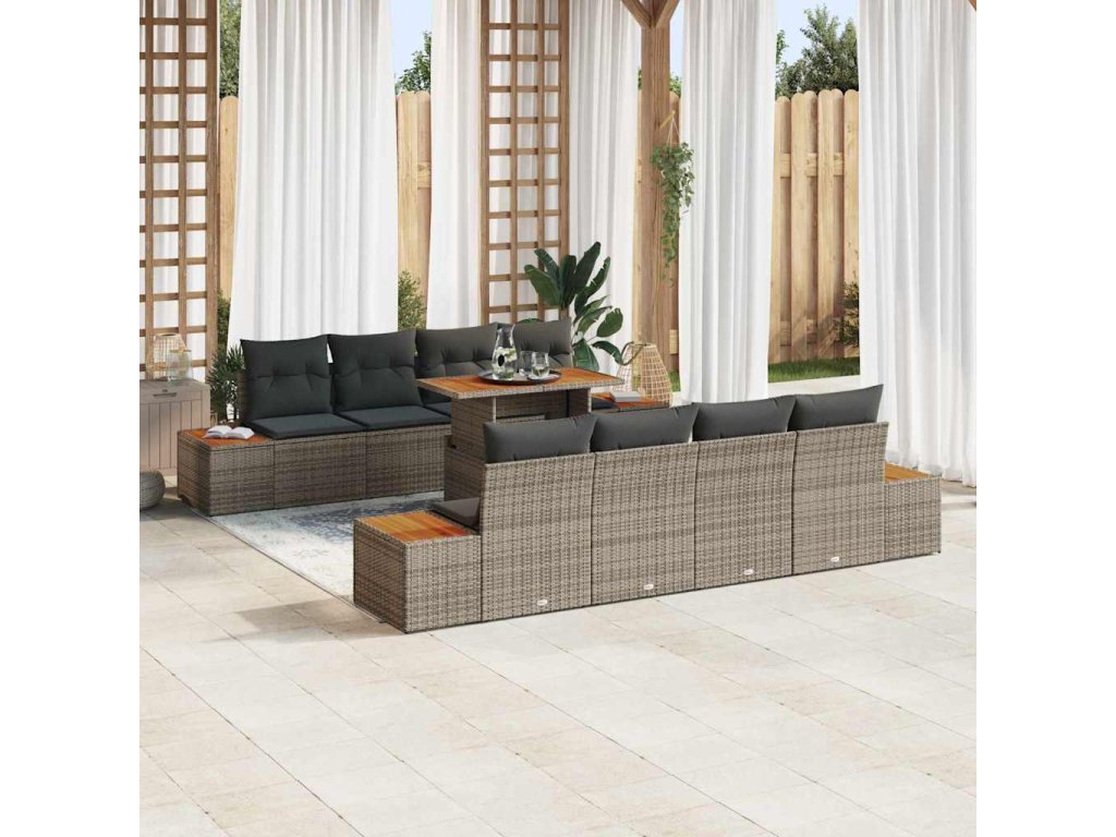 Sada zahradního nábytku z polyratanu je super cool a praktická volba pro venkovní stolování, s moderním stylem, který skvěle sedí do zahrad a teras. Je vyrobená z kombinace polyratanu a solidního akáciového dřeva, takže spojuje eleganci a funkčnost a vytváří skvělé místo pro parádní venkovní setkání. Je navržená tak, aby byla flexibilní, takže si můžeš přesně přizpůsobit rozložení podle potřeby - ideální pro různorodé venkovní prostředí.