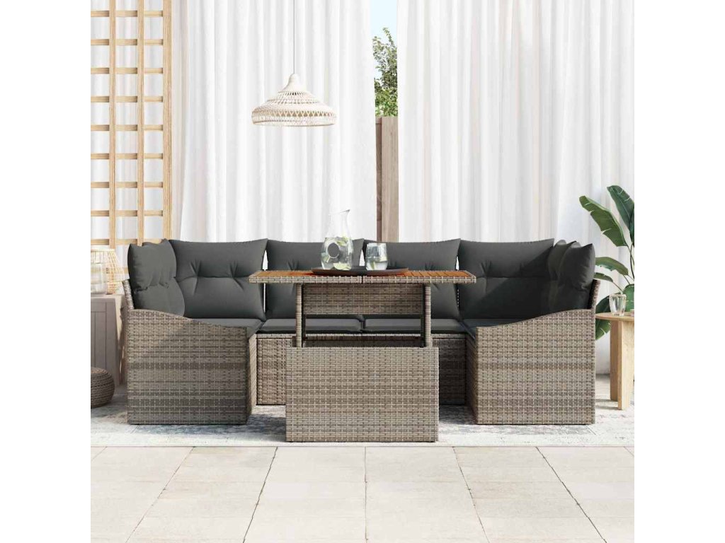 - Praktické komponenty: Tento set zahrnuje dvě pohovky s opěrkami, dvě rohová sedadla, dvě středová sedadla a jeden zahradní stůl, každý s integrovanými úložnými funkcemi. Navržené pro venkovní pohodlí, kusy nábytku poskytují prostorné oddíly pro udržení nezbytností organizovaných a skrytých, čímž udržují uklizený a funkční venkovní prostor.