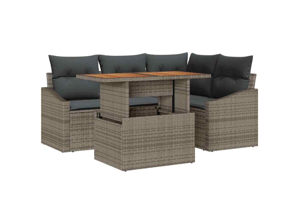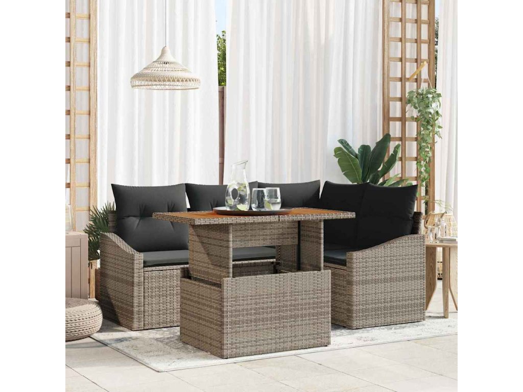 - Odolné materiály: Poly ratan a práškově lakované ocelové komponenty zajišťují, že je set odolný vůči různým povětrnostním podmínkám, nabízí UV ochranu a trvanlivost pro dlouhodobé venkovní použití. Stabilní akáciové dřevěné povrchy dodávají přírodní krásu a robustní podporu, udržují atraktivní a odolnou přítomnost na vaší terase nebo zahradě.