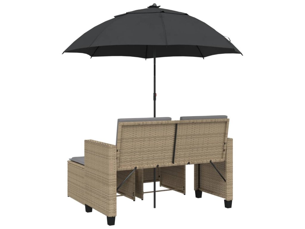 - Praktický slunečník: Zahradní pohovka je vybavena slunečníkem s naklápěcím mechanismem, který umožňuje snadné nastavení stříšky pro optimální zastínění a ochranu před sluncem.