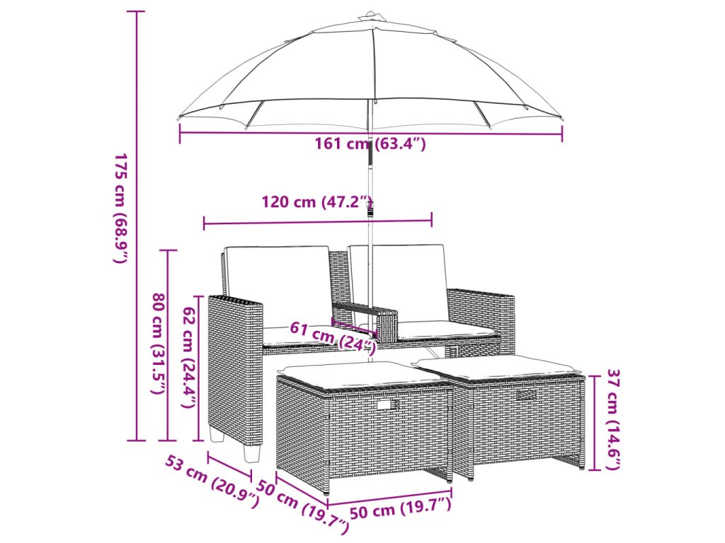 Tato zahradní pohovka se slunečníkem a podnožkami je dokonalým doplňkem vaší zahrady, terasy nebo dvorku a poskytne vám pohodlné a příjemné místo, kde si můžete povídat s rodinou a přáteli nebo jen tak odpočívat a užívat si pobyt venku.