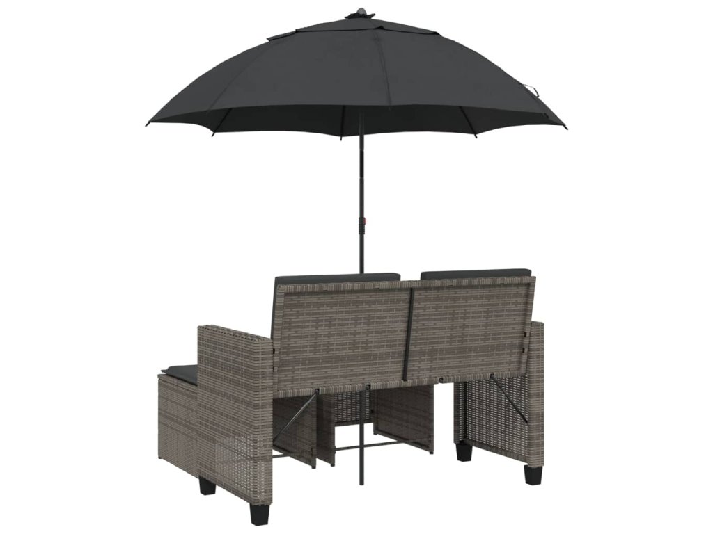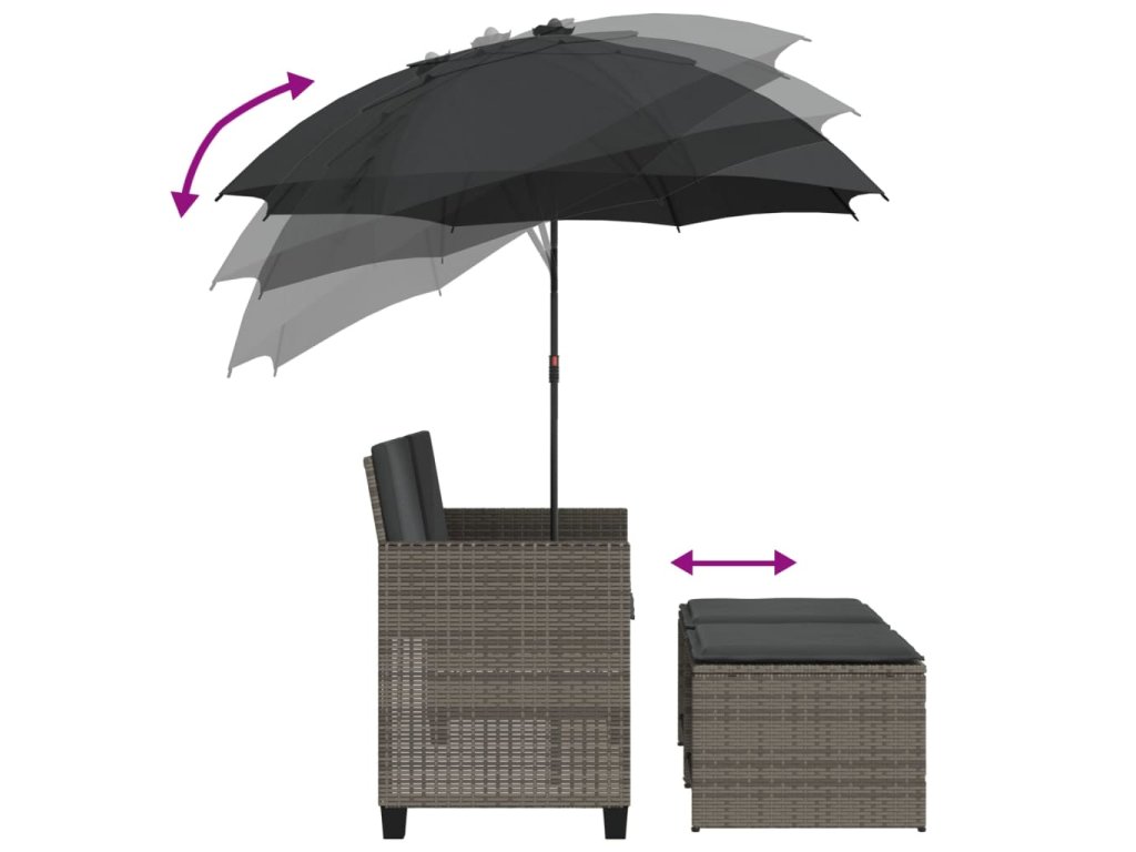 - Praktický slunečník: Zahradní pohovka je vybavena slunečníkem s naklápěcím mechanismem, který umožňuje snadné nastavení stříšky pro optimální zastínění a ochranu před sluncem.