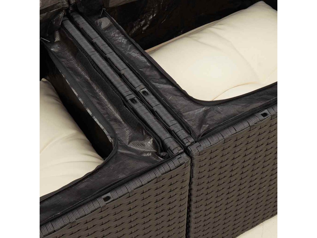 - Úložný prostor s voděodolným vakem: Každý zahradní sedací díl má úložný prostor pod sedákem, který je opatřen voděodolnou vložkou a poslouží vám k ukládání podušek, hraček a dalších věcí. Vnitřní vaky mají horní kryt a lze je bezpečně připevnit k sedákům pomocí suchého zipu, což zaručí větší stabilitu.