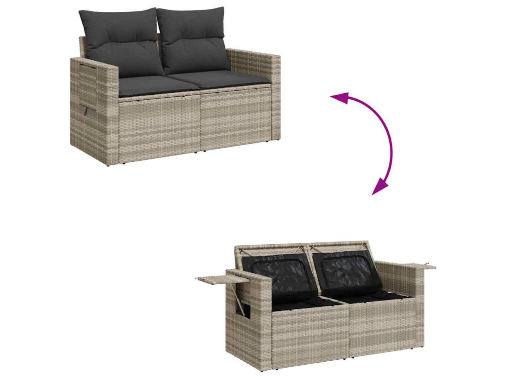 - Úložný prostor s voděodolným vakem: Každý zahradní sedací díl má úložný prostor pod sedákem, který je opatřen voděodolnou vložkou a poslouží vám k ukládání podušek, hraček a dalších věcí. Vnitřní vaky mají horní kryt a lze je bezpečně připevnit k sedákům pomocí suchého zipu, což zaručí větší stabilitu.