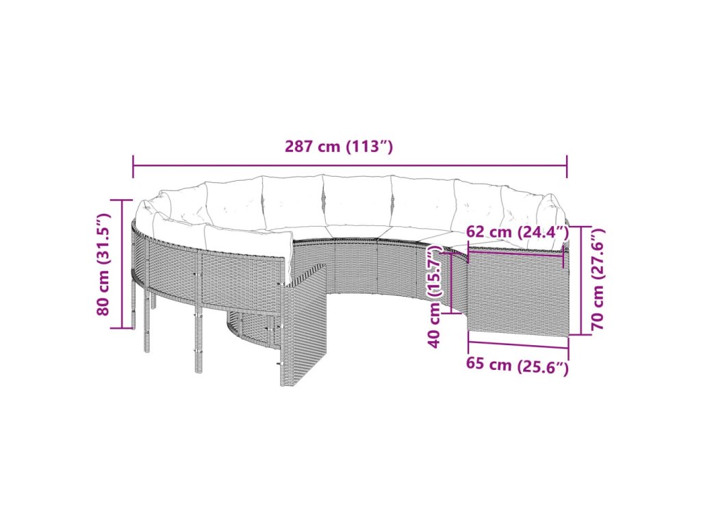 Tato zahradní pohovka kulatého tvaru je dokonalým doplňkem vaší zahrady, terasy nebo dvorku a poskytne vám pohodlné a příjemné místo, kde si můžete povídat s rodinou a přáteli nebo jen tak odpočívat a užívat si pobyt venku.