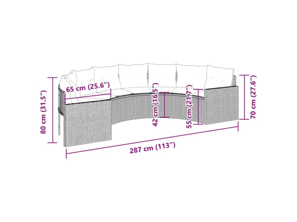 Tato půlkruhová zahradní sedací souprava je dokonalým doplňkem vaší zahrady, terasy nebo dvorku a poskytne vám pohodlné a příjemné místo, kde si můžete povídat s rodinou a přáteli nebo jen tak odpočívat a užívat si pobyt venku.