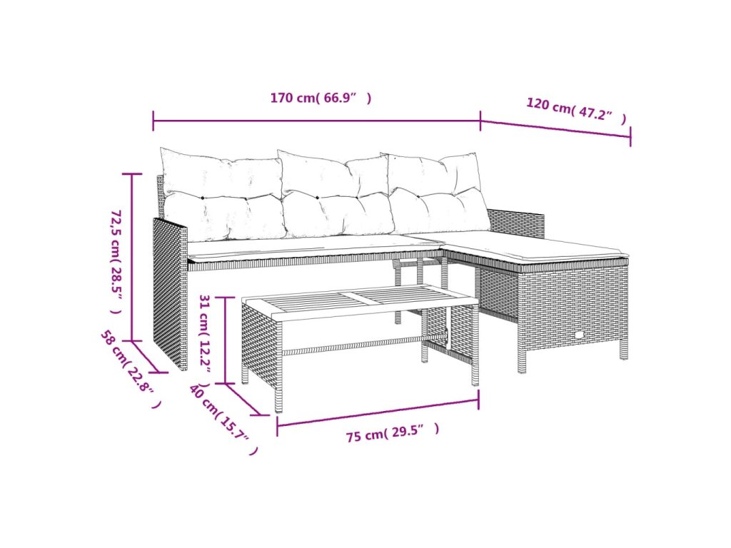 Tato zahradní pohovka ve tvaru písmene L je dokonalým doplňkem vaší zahrady, terasy nebo dvorku a poskytne vám pohodlné a příjemné místo, kde si můžete povídat s rodinou a přáteli nebo jen tak odpočívat a užívat si pobyt venku.
