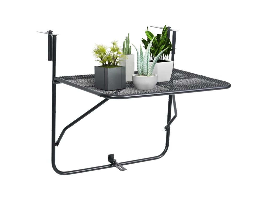 Odkládací stolek je vyrobený z robustní oceli, je klimaticky odolný a stabilní. Jeho pletivový design a černá e-coating povrchová úprava váš balkon zkrášlí industriálním šarmem. Stolek je také sklopný, takže snadno ušetříte místo, když stolek právě nepoužíváte.
