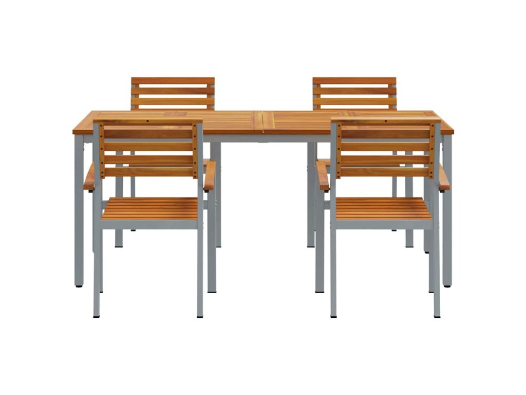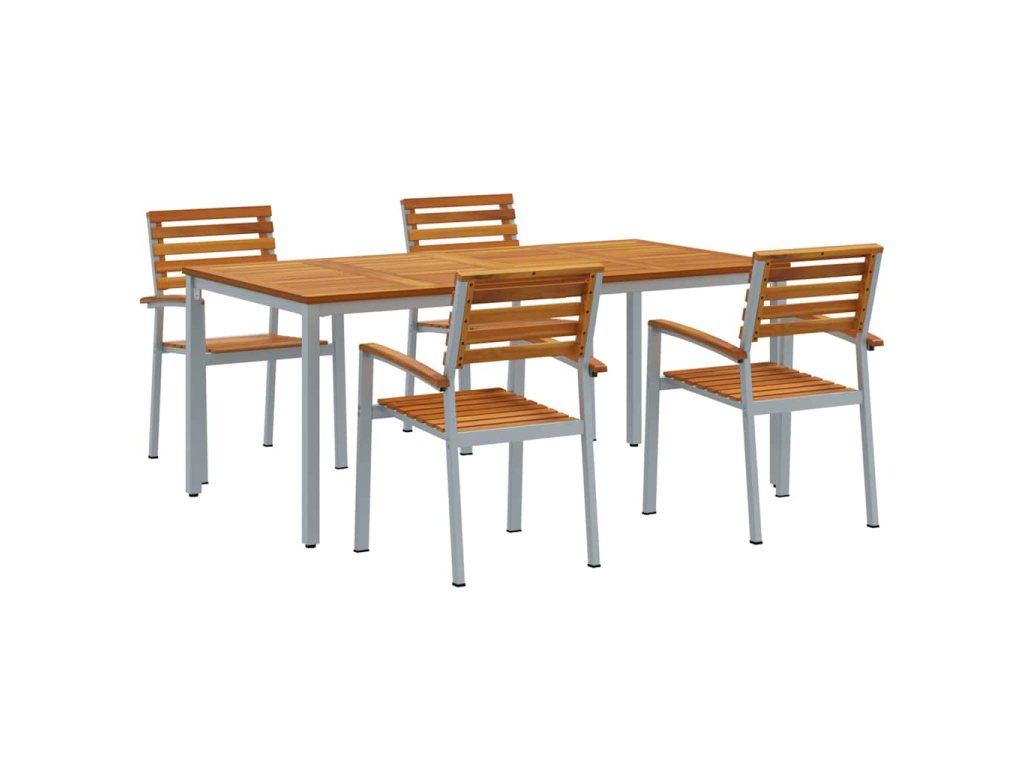 Materiály: Vyrobený z kvalitní oceli a masivního akátového dřeva, je tento zahradní jídelní set odolný a stylový. Přírodní dřevo vypadá skvěle a ocel zajišťuje, že je dost silný a vydrží dlouho. Tato kombinace nejenže skvěle vypadá, ale také plní všechna očekávání na venkovní použití. Součásti setu: Set obsahuje prostorný stůl a dostatek pohodlných židlí, všechny vyrobené z akátového dřeva. Ocelové nohy dodávají stabilitu, takže je ideální na různé povrchy zahrady nebo terasy. Vlastnosti/Funkce/Design: Tento set je navržený tak, aby odolal povětrnostním vlivům, takže je skvělý na venkovní použití. Jeho moderní vzhled se hodí k jakémukoliv venkovnímu dekoru a přidá svěží nádech vaší zahradě bez potřeby velké změny. Doporučené použití: Super na rodinná jídla a velké akce. Tento jídelní set poskytně spoustu místa pro více lidí, nabízí stylovou a praktickou volbu. Ať už chystáte narozeninovou oslavu, nebo si užíváte klidnou večeři pod hvězdami, přizpůsobí se vašim potřebám. Péče a údržba: Udržujte ho v dobrém stavu chráněním před silným deštěm a přímým sluncem. Jednoduché otření vlhkým hadříkem stačí k údržbě, pomůže mu to zůstat hezký a funkční dlouho.- Barva: Šedo-hnědá