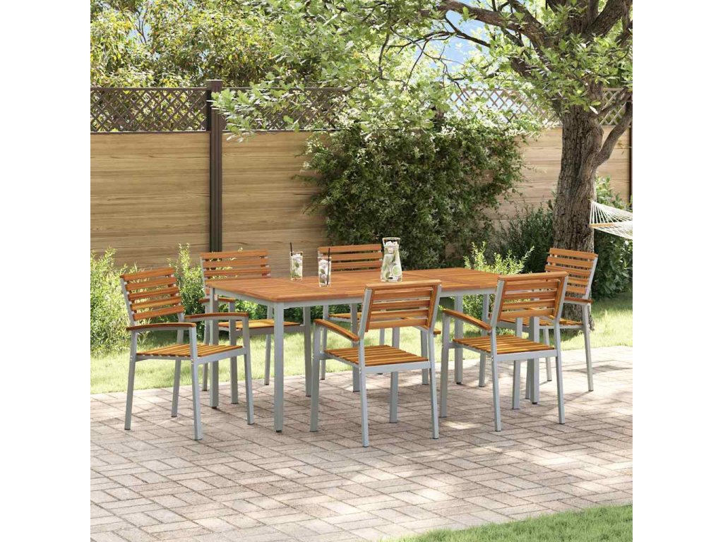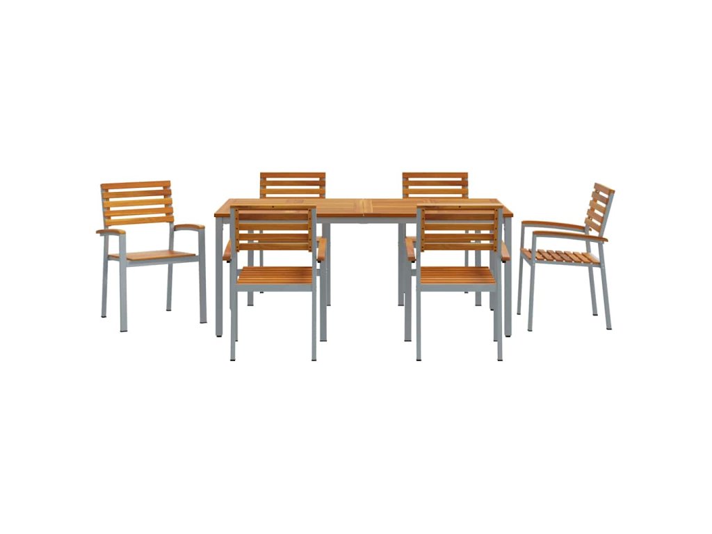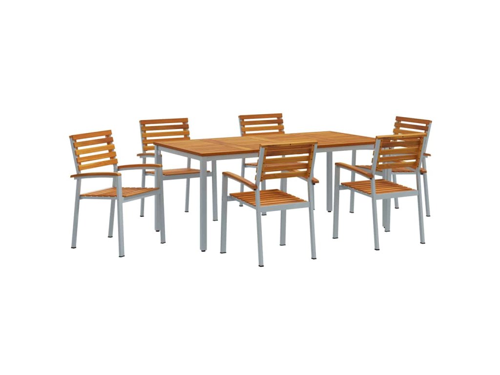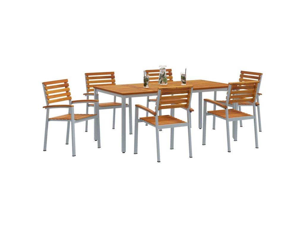 - Součásti setu: Set obsahuje prostorný stůl a dostatek pohodlných židlí, všechny vyrobené z akátového dřeva. Ocelové nohy dodávají stabilitu, takže je ideální na různé povrchy zahrady nebo terasy.