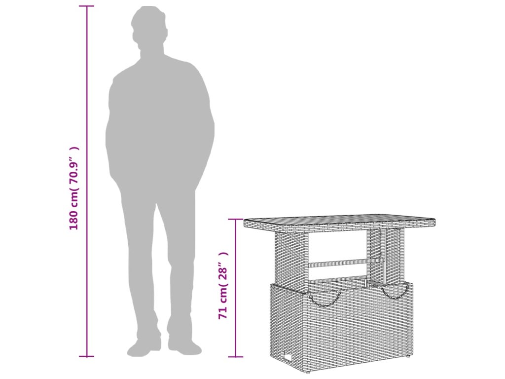 - Materiál: PE ratan, práškově lakovaná ocel, masivní akáciové dřevo s olejovou povrchovou úpravou