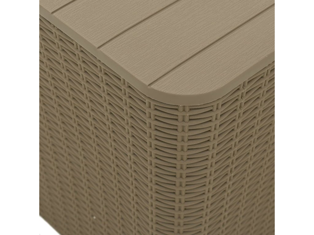- Design s texturou imitující ratan: Zahradní stůl imituje ratanovou texturu, která dodá vašemu venkovnímu obytnému prostoru přírodní kouzlo.