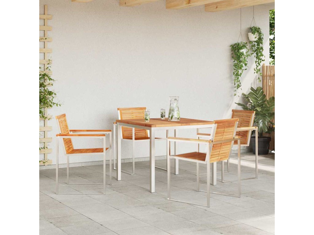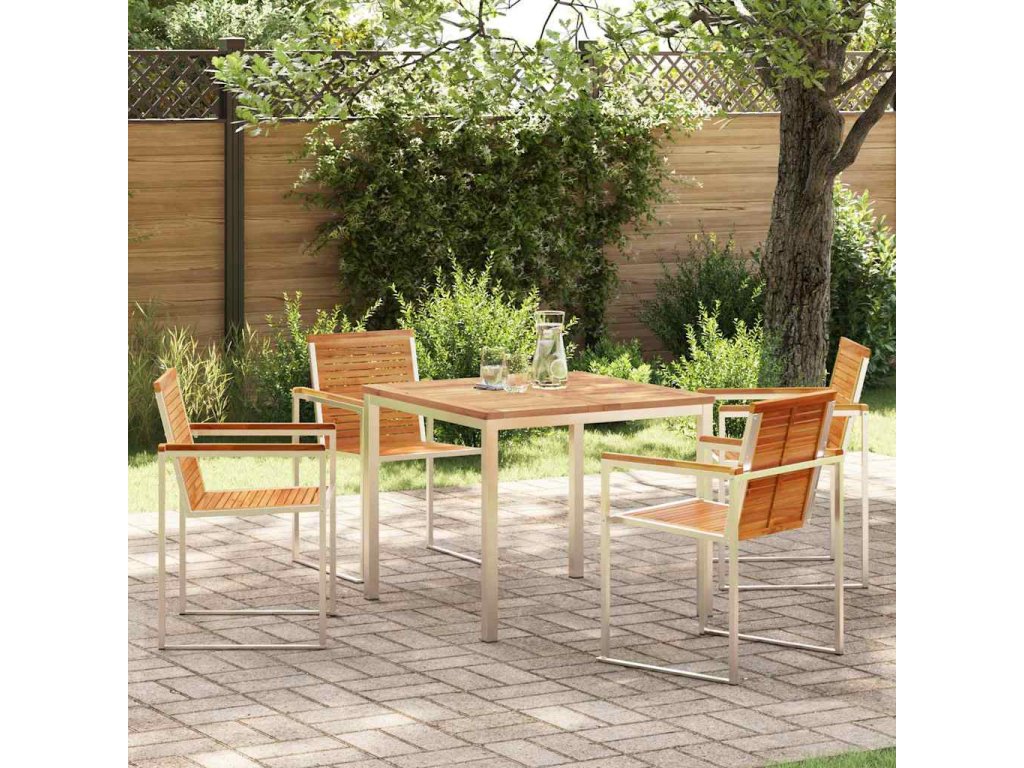 Pevný rám: Silný ocelový rám zajišťuje stabilitu, abyste si mohli v klidu vychutnávat jídlo. Je odolný vůči venkovním podmínkám, což ho činí skvělou volbou pro časté venkovní posezení. Elegantní dřevěný povrch: Dřevěná deska stolu dodává přírodní vzhled a skvěle ladí s ocelovým rámem. Je navržena tak, aby měla dobrý odtok, což usnadňuje údržbu a skvěle vypadá na vašem venkovním prostoru. Odolný design: Tento set je vytvářen pro venkovní použití, zvládne jakékoli počasí. Můžete mít klid, že bude silný a vypadat skvěle, ať prší, nebo svítí slunce, díky svému chytrému designu. Moderní funkční styl: Svým moderním vzhledem a jednoduchými detaily se tento set snadno hodí do současných venkovních prostor, kombinuje funkčnost a styl bez námahy. Jednoduché pokyny pro údržbu: Aby byl v perfektním stavu, zakryjte ho, když ho nepoužíváte, a otřete vlhkým hadříkem. Tyto jednoduché tipy na údržbu zajistí, že váš jídelní set zůstane v dobrém stavu dlouho!- Materiál: Masivní teakové dřevo