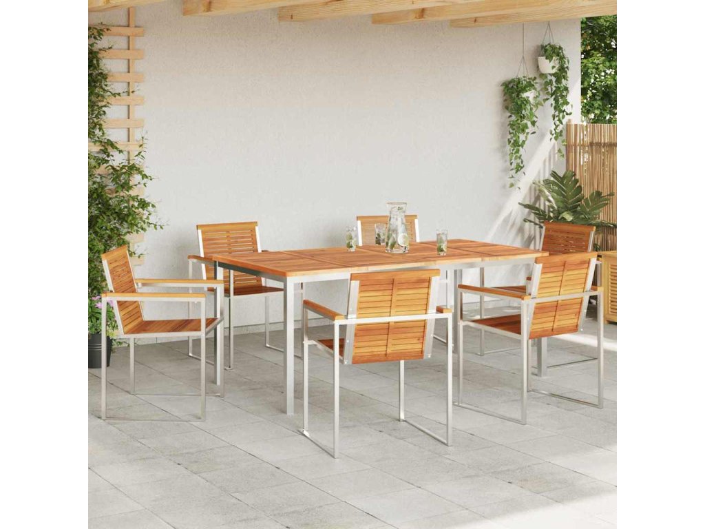 Pevný rám: Silný ocelový rám zajišťuje stabilitu, abyste si mohli v klidu vychutnávat jídlo. Je odolný vůči venkovním podmínkám, což ho činí skvělou volbou pro časté venkovní posezení. Elegantní dřevěný povrch: Dřevěná deska stolu dodává přírodní vzhled a skvěle ladí s ocelovým rámem. Je navržena tak, aby měla dobrý odtok, což usnadňuje údržbu a skvěle vypadá na vašem venkovním prostoru. Odolný design: Tento set je vytvářen pro venkovní použití, zvládne jakékoli počasí. Můžete mít klid, že bude silný a vypadat skvěle, ať prší, nebo svítí slunce, díky svému chytrému designu. Moderní funkční styl: Svým moderním vzhledem a jednoduchými detaily se tento set snadno hodí do současných venkovních prostor, kombinuje funkčnost a styl bez námahy. Jednoduché pokyny pro údržbu: Aby byl v perfektním stavu, zakryjte ho, když ho nepoužíváte, a otřete vlhkým hadříkem. Tyto jednoduché tipy na údržbu zajistí, že váš jídelní set zůstane v dobrém stavu dlouho!- Materiál: Masivní akáciové dřevo