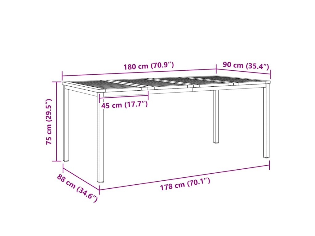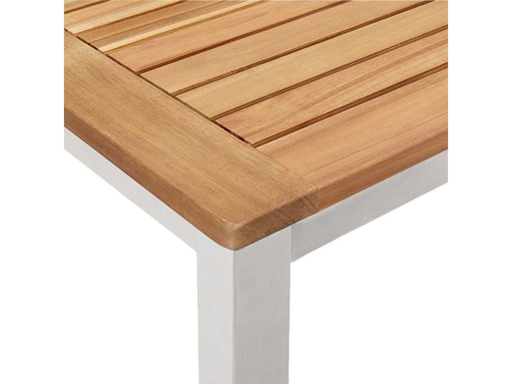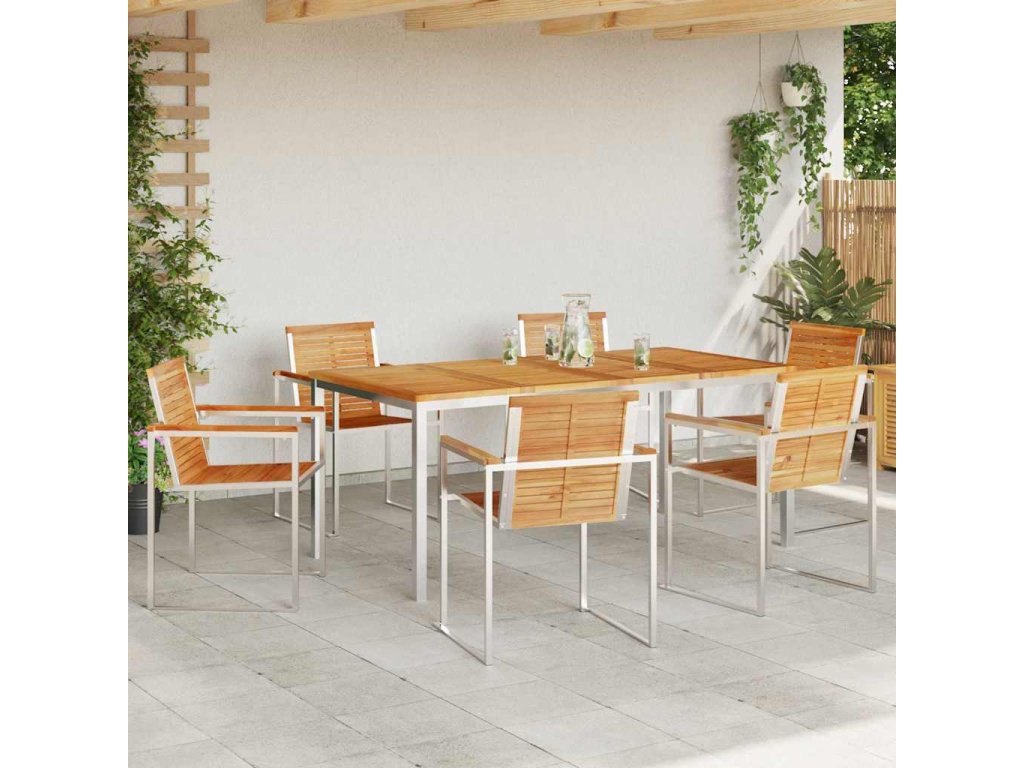 Pevný rám: Silný ocelový rám zajišťuje stabilitu, abyste si mohli v klidu vychutnávat jídlo. Je odolný vůči venkovním podmínkám, což ho činí skvělou volbou pro časté venkovní posezení. Elegantní dřevěný povrch: Dřevěná deska stolu dodává přírodní vzhled a skvěle ladí s ocelovým rámem. Je navržena tak, aby měla dobrý odtok, což usnadňuje údržbu a skvěle vypadá na vašem venkovním prostoru. Odolný design: Tento set je vytvářen pro venkovní použití, zvládne jakékoli počasí. Můžete mít klid, že bude silný a vypadat skvěle, ať prší, nebo svítí slunce, díky svému chytrému designu. Moderní funkční styl: Svým moderním vzhledem a jednoduchými detaily se tento set snadno hodí do současných venkovních prostor, kombinuje funkčnost a styl bez námahy. Jednoduché pokyny pro údržbu: Aby byl v perfektním stavu, zakryjte ho, když ho nepoužíváte, a otřete vlhkým hadříkem. Tyto jednoduché tipy na údržbu zajistí, že váš jídelní set zůstane v dobrém stavu dlouho!- Materiál: Masivní teakové dřevo
