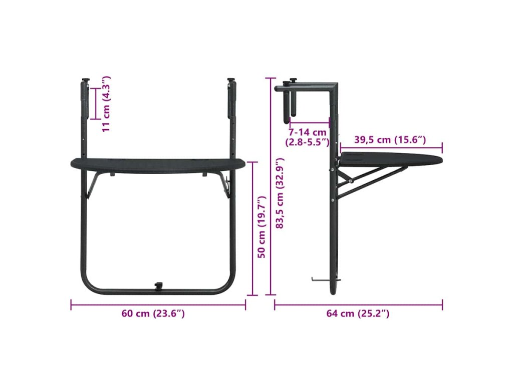 Závěsný stůl na balkon černý 60x64x83,5cm plast ratanový vzhled 47894
