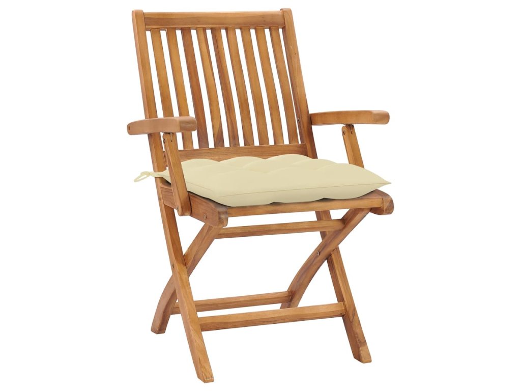 Nábytek je zhotovený z extrémně odolného teakového tvrdého dřeva, které již prošlo procesem smršťování, bylo uměle vysušené a poté jemně a dohladka obroušené. Teakové dřevo je oceňované pro svou výjimečnou pevnost a klimatickou odolnost, a proto je jedním z nejoblíbenějších materiálů pro výrobu zahradního nábytku. Jedná se o skvělou volbu, pokud si chcete pořídit venkovní výbavu, která vám bude sloužit dlouhá léta. Jídelní židle mají obroušený povrch, takže jsou odolné vůči povětrnostním podmínkám a snadno se čistí. Navíc je můžete složit, čímž ušetříte místo ve chvílích, kdy je zrovna nebudete používat. Podušky, které jsou součástí sady, nabízí mimořádné pohodlí. Každá poduška je opatřená 2 páry šňůrek, abyste mohli podušku pevně přivázat k židli.
