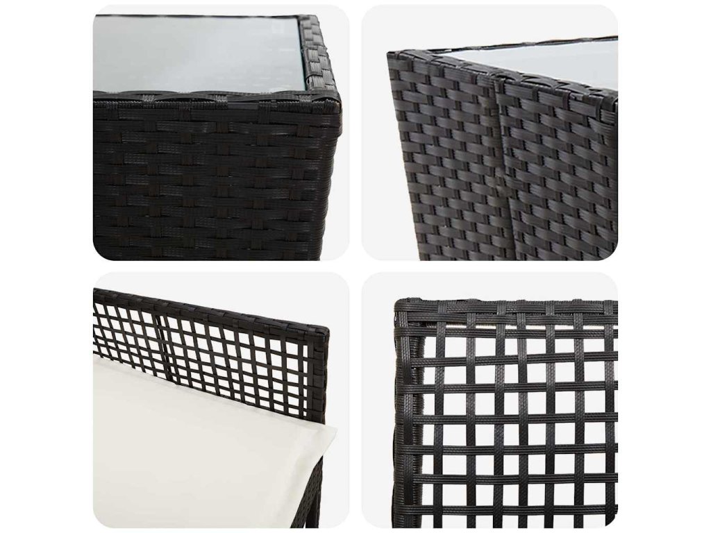 - Zahrnuté komponenty: Set obsahuje snadno omyvatelný tvrzený skleněný stůl a pohodlné pěnové polštáře s poly ratanovými opěradly, které nabízí podporu. Všechny kusy spolu ladí a vytvářejí hezký venkovní prostor.