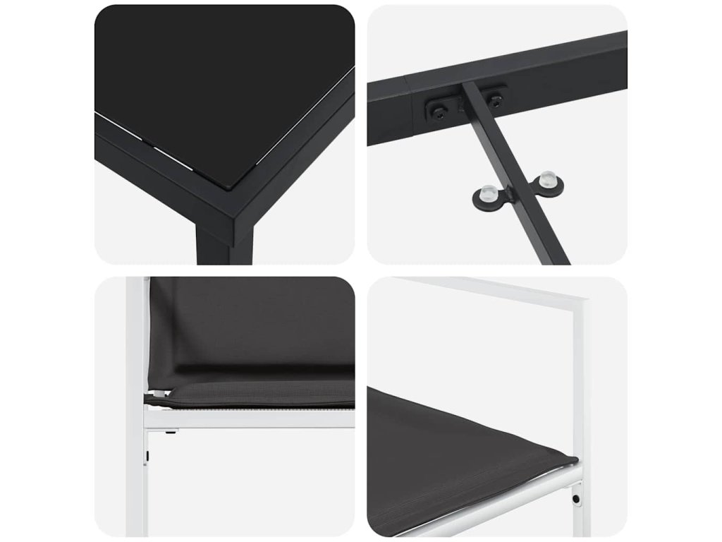 - Materiály: Sada je vyrobená z textilního materiálu, který rychle schne a je dost odolný, takže se pohodlně používá a vydrží. Tvrzené sklo na stole dodává povrchu atraktivní vzhled a zajišťuje bezpečnost. Práškově lakované ocelové rámy jsou robustní a vydrží venkovní povětrnostní podmínky, což zajišťuje stabilní oporu během jakéhokoli setkání.