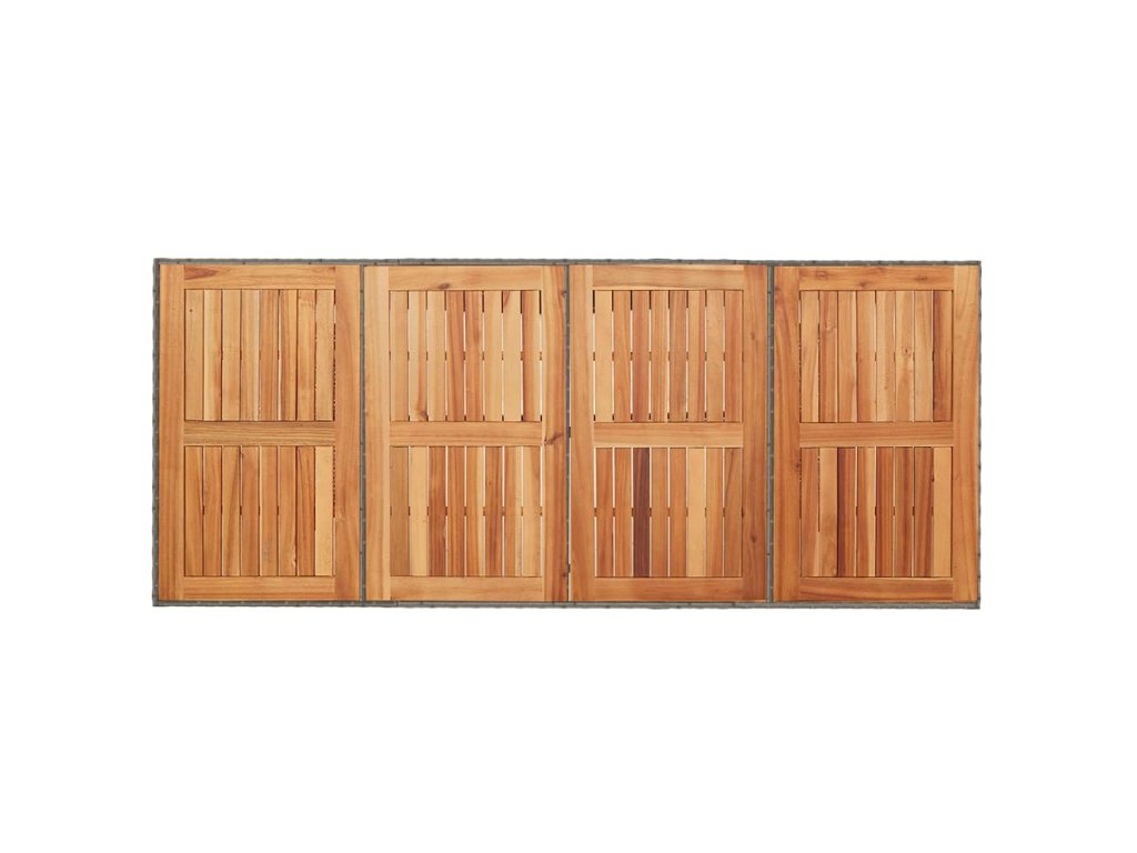 - Prvky z masivního akáciového dřeva Opěrky a stůl jsou vyrobené z akáciového dřeva, co se cení pro svoji odolnost a přirozenou krásu. Tenhle materiál parádně doplňuje polyratan a dodává setu styl a pevnost, ideální pro jakékoliv venkovní uspořádání.