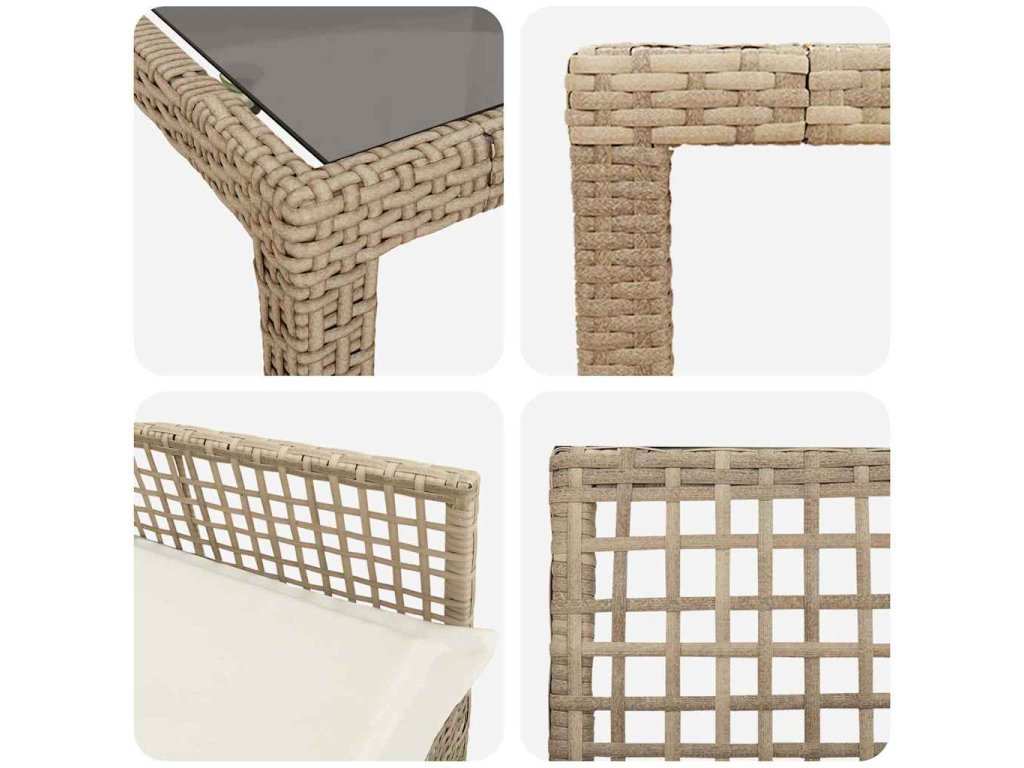 - Materiály: Tato sada je vyrobená z poly ratanu, který je známý svou pevností a stylovým vzhledem. Tvrzené sklo stolu dodává moderní vibe a je odolné vůči povětrnostním podmínkám.
