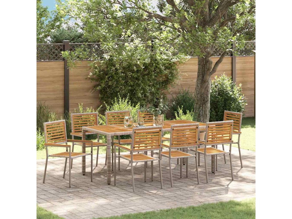 Vysoce kvalitní materiály Zahradní set má poly ratan na sedáky a opěradla, což zajišťuje skvělou odolnost proti povětrnostním vlivům. Kombinace s pevným akáciovým dřevem na površích mu dává přirozený a atraktivní vzhled, podpořený moderními nezkorodujícími ocelovými nohami, které zajišťují stabilitu pro jakékoli venkovní použití. Funkční design Minimalistická struktura setu má design s opěrkami, které ukazují jeho praktičnost. Ploché opěrky rukou dodávají hladký finiš, takže můžete jíst nebo relaxovat venku v pohodlí a stylu. Užijte si flexibilitu a příjemnou atmosféru pokaždé, když ho použijete. Upravené pohodlí Typ opěradla je příjemný a podporuje pohodlné sezení, takže si můžete užít dlouhé jídlo s maximálním komfortem. Ploché opěrky rukou lákají k uvolněné pozici, ideální pro pohodové lenošení venku. Venkovní nezbytnosti Tento set je postavený tak, aby zvládal různé venkovní podmínky. Jeho nadčasový design se hodí do různých uspořádání a zlepšuje atmosféru pro jakoukoli venkovní akci, ať už se jedná o neformální rodinné večeře nebo elegantní večírky. Péče je jednoduchá Udržet nábytek v dobrém stavu je snadné s pár základními kroky. Chraňte svůj venkovní set zakrýváním, když ho nepoužíváte, aby zůstal lesklý a krásný rok suitable for co rok.- Barva: Šedá a hnědá