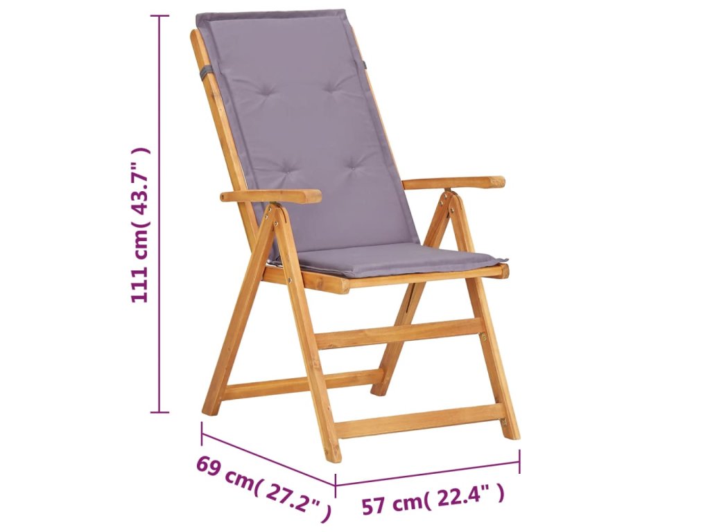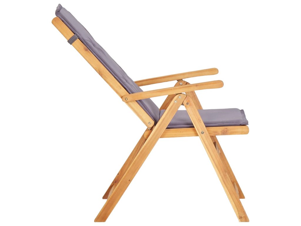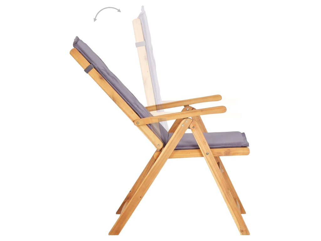 Sada polohovacích židlí je vyrobená z masivního akáciového dřeva, což je tropická tvrdá dřevina, která výborně vzdoruje klimatickým vlivům a má dlouhou životnost. Látkové podušky vám při sezení poskytnou mimořádné pohodlí. Opěradlo židle lze naklopit do 5 různých poloh, aby se vám vždy podařilo najít tu nejpříjemnější pozici. Vzhledem k jejich lehkému designu se židle dají bez námahy přesouvat po celém domě. A když je právě nepotřebujete, můžete je složit, abyste ušetřili místo.