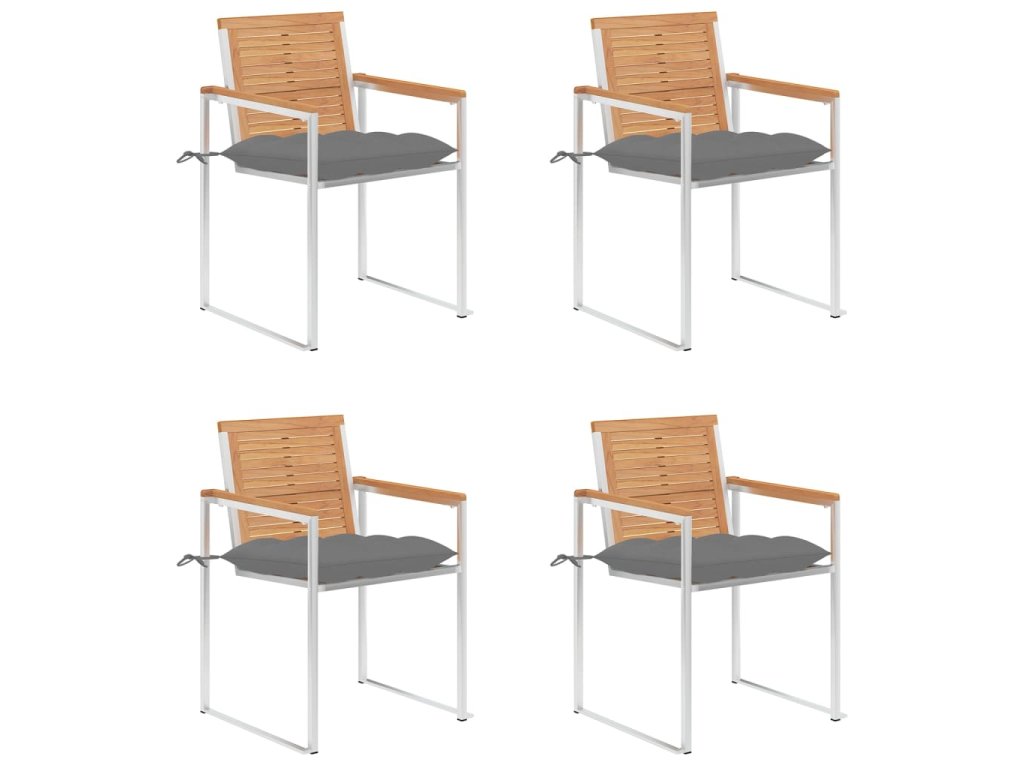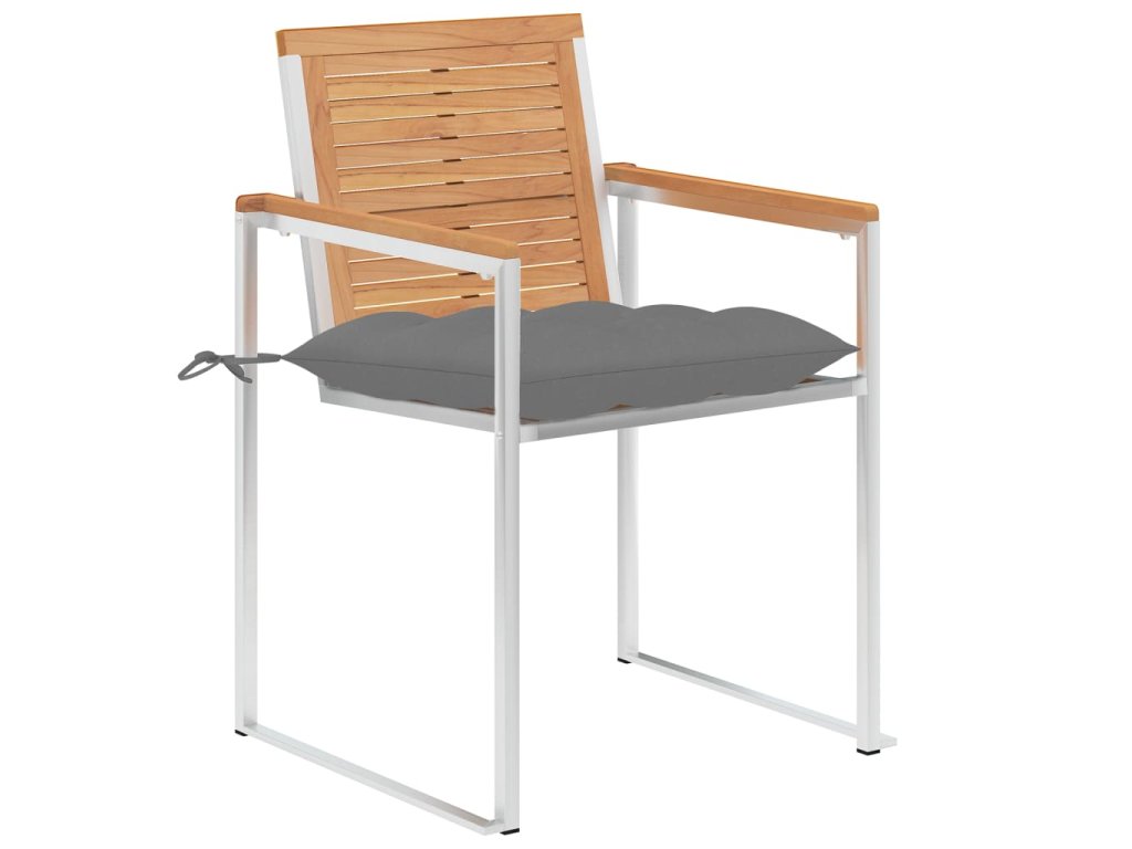 Nábytek je zhotovený z extrémně odolného teakového tvrdého dřeva, které již prošlo procesem smršťování, bylo uměle vysušené a poté jemně a dohladka obroušené. Teakové dřevo je oceňované pro svou výjimečnou pevnost a klimatickou odolnost, a proto je jedním z nejoblíbenějších materiálů pro výrobu zahradního nábytku. Je to skvělá volba, pokud si chcete pořídit venkovní výbavu, která vám vydrží sloužit dlouhá léta. Vzhledem k rámu z vysoce kvalitní nerezové oceli jsou židle zároveň robustní a odolné vůči korozi. Přiložená poduška slouží nejen jako praktický doplněk – plní také dekorativní funkci. Posaďte se a dopřejte si venku skvělou večeři nebo si jen tak odpočiňte a užívejte si počasí s touto klasickou sadou zahradních židlí.
