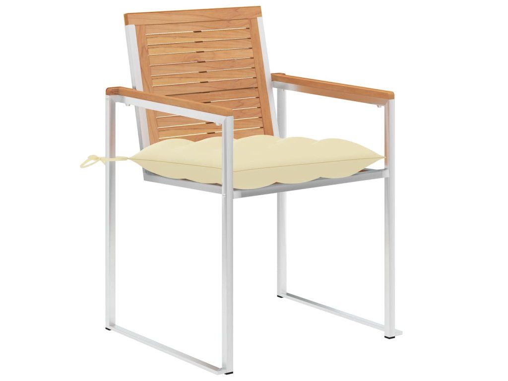Nábytek je zhotovený z extrémně odolného teakového tvrdého dřeva, které již prošlo procesem smršťování, bylo uměle vysušené a poté jemně a dohladka obroušené. Teakové dřevo je oceňované pro svou výjimečnou pevnost a klimatickou odolnost, a proto je jedním z nejoblíbenějších materiálů pro výrobu zahradního nábytku. Je to skvělá volba, pokud si chcete pořídit venkovní výbavu, která vám vydrží sloužit dlouhá léta. Vzhledem k rámu z vysoce kvalitní nerezové oceli jsou židle zároveň robustní a odolné vůči korozi. Přiložená poduška slouží nejen jako praktický doplněk – plní také dekorativní funkci. Posaďte se a dopřejte si venku skvělou večeři nebo si jen tak odpočiňte a užívejte si počasí s touto klasickou sadou zahradních židlí.