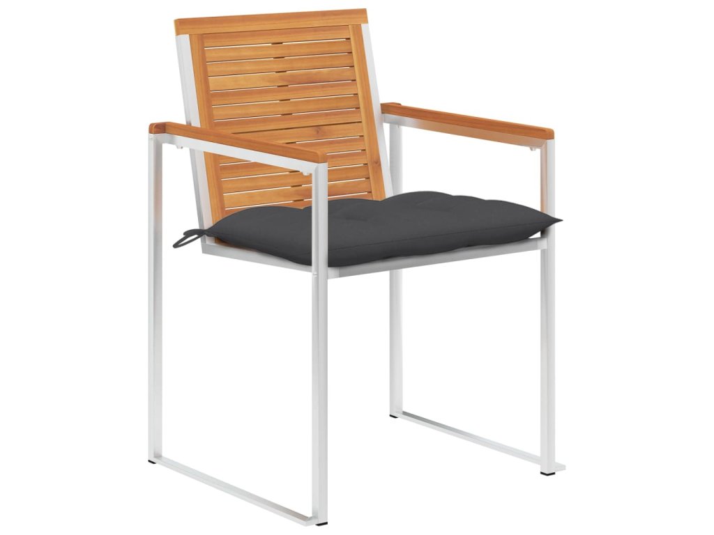 Jídelní židle jsou vyrobené z masivního akáciového dřeva a prvotřídní nerezové oceli. Proto mají dlouhou životnost, jsou odolné vůči rzi, robustní a snadno se čistí vlhkým hadříkem. Podušky, jež jsou více než jen praktický doplněk, mají také dekorativní funkci. Usaďte se k chutné večeři na zahradě nebo odpočívejte a užívejte si počasí s touto sadou klasických zahradních židlí.